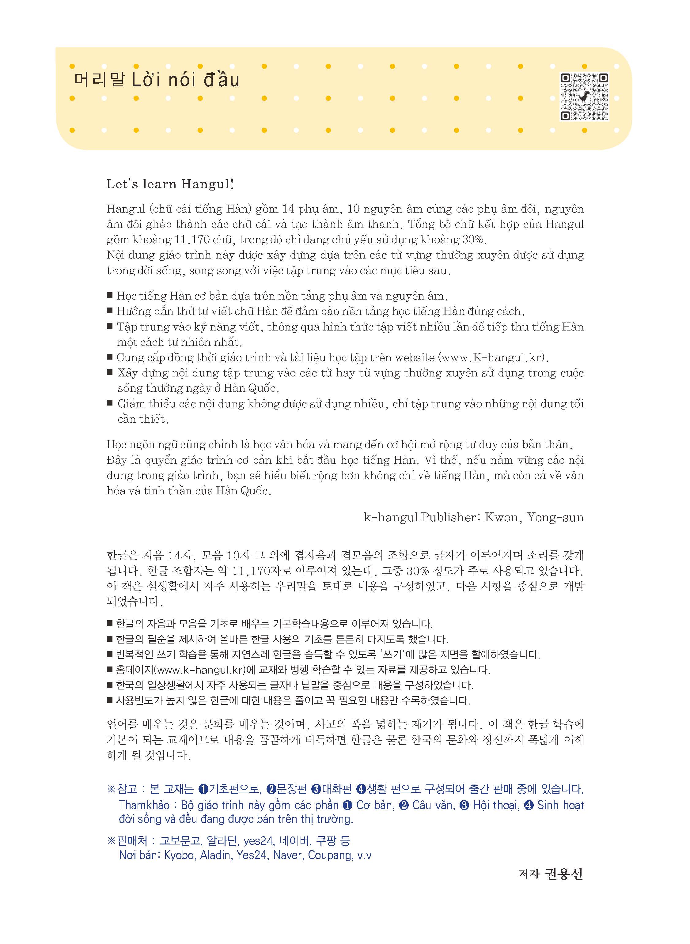 '외국인을 위한 기초 한글 배우기'는 2016년 초판이 출간되어, 현재 교보문고, 예스24,