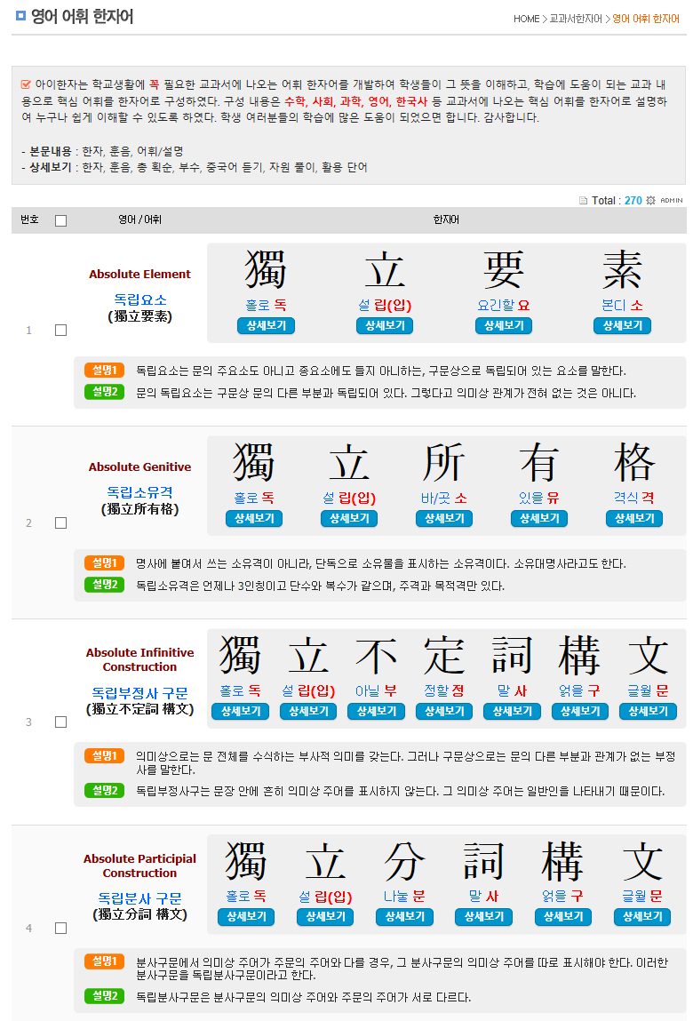 아이한자는 학교생활에 꼭 필요한 교과서에 나오는 어휘를 한자어로 개발하여 학생들이 그 뜻을 이해하고, 학습에 도움이 되는 교과 내용으로 핵심 어휘를 한자어로 구성하였습니다. 구성 내용은 수학, 사회, 과학, 영어, 한국사 등 교과서에 나오는 핵심 어휘를 한자어로 설명하여 누구나 쉽게 이해하도록 하였으며, 그 내용을 아래와 같이 안내드립니다.
