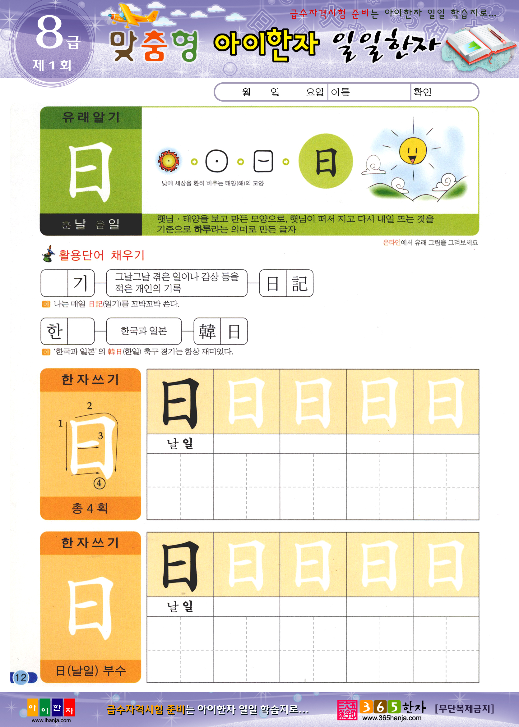 아이한자는 이번에 새로이 "일일한자 학습지 콘텐츠"를 개발하여 누구나 쉽게 접할 수 있는 한자학습지 서비스를 아래와 같이 안내드립니다.
