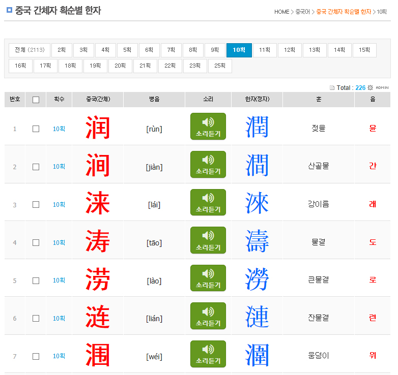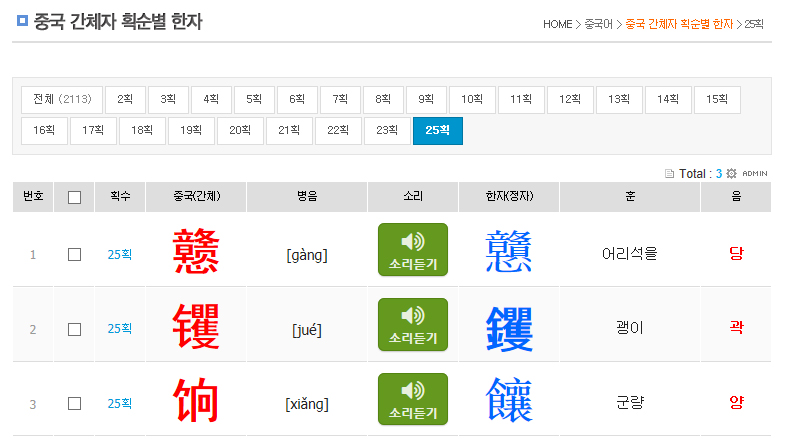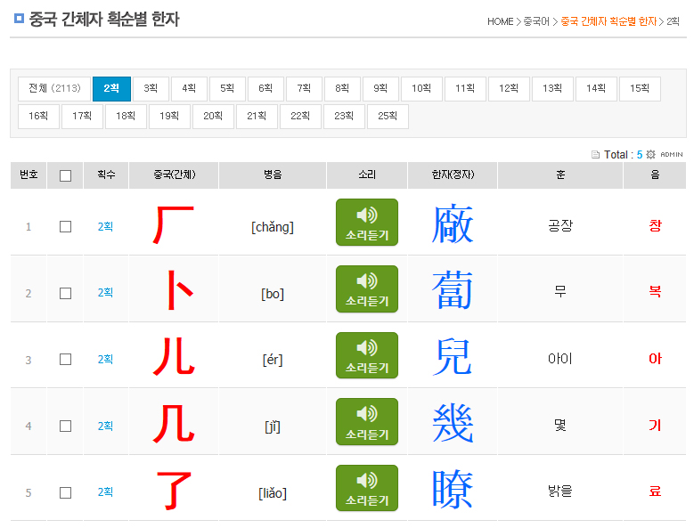 안녕하세요... 홍익교육 아이한자입니다. 당사는 이번에 새로 “중국어 간체자 획순별 한자”를 개발하여, 고객 여러분들이 중국어를 쉽게 배울 수 있도록 아래와 같이 안내 드립니다. (구성 내용 : 2획 ~ 25획) ①중국어(簡體字) ②병음 ③듣기 ④한자(正字) ⑤훈.음