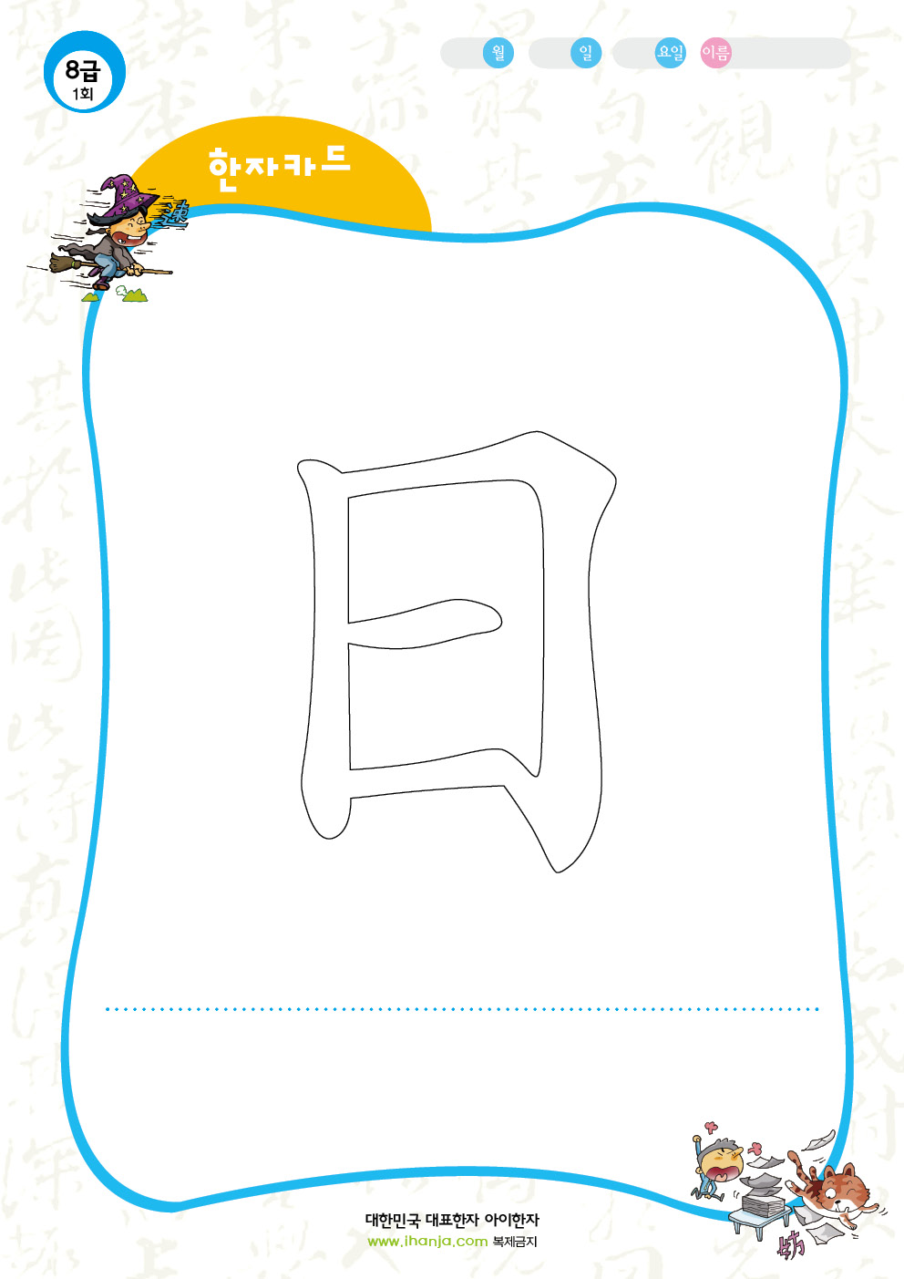 안녕하세요... 아이한자입니다. 일일한자 프린트에서 색칠 놀이 한자카드(8급) 50자를 추가 서비스 안내드립니다. *참고 상단 메뉴 중 "온라인 급수한자"에서 플래시 한자를 참고하여 학습하시길 바랍니다. 감사합니다.
