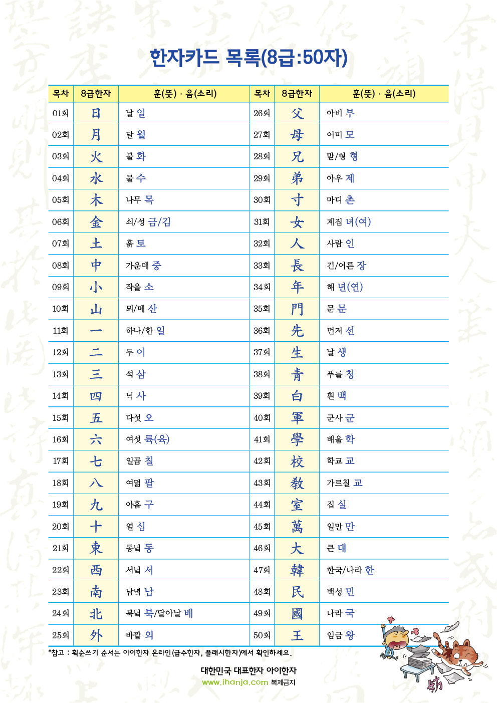일일한자 프린트에서 색칠 놀이 한자카드(8급) 50자를 추가 서비스 안내드립니다.