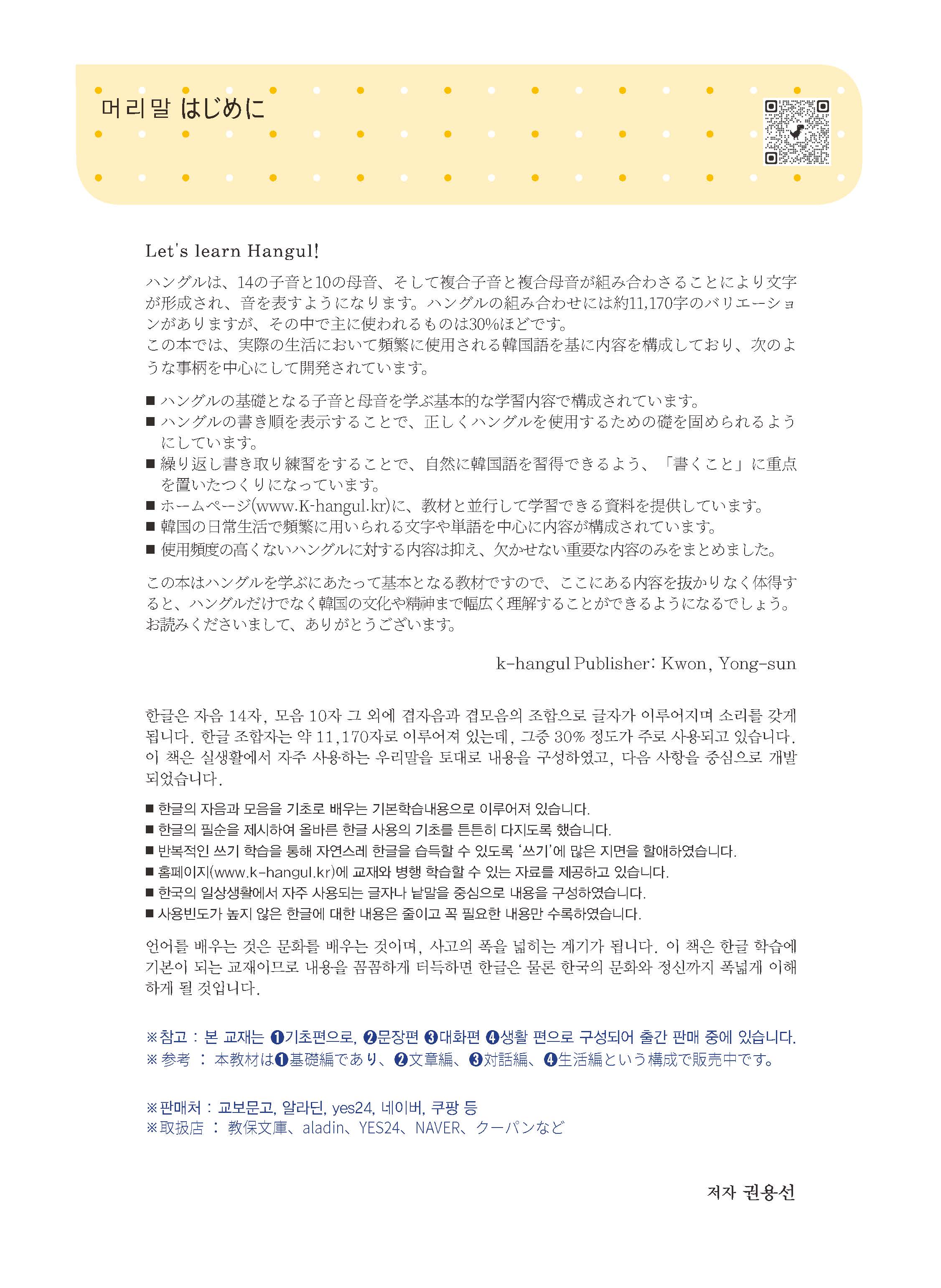 '외국인을 위한 기초 한글 배우기'는 2016년 초판이 출간되어, 현재 교보문고, 예스24,