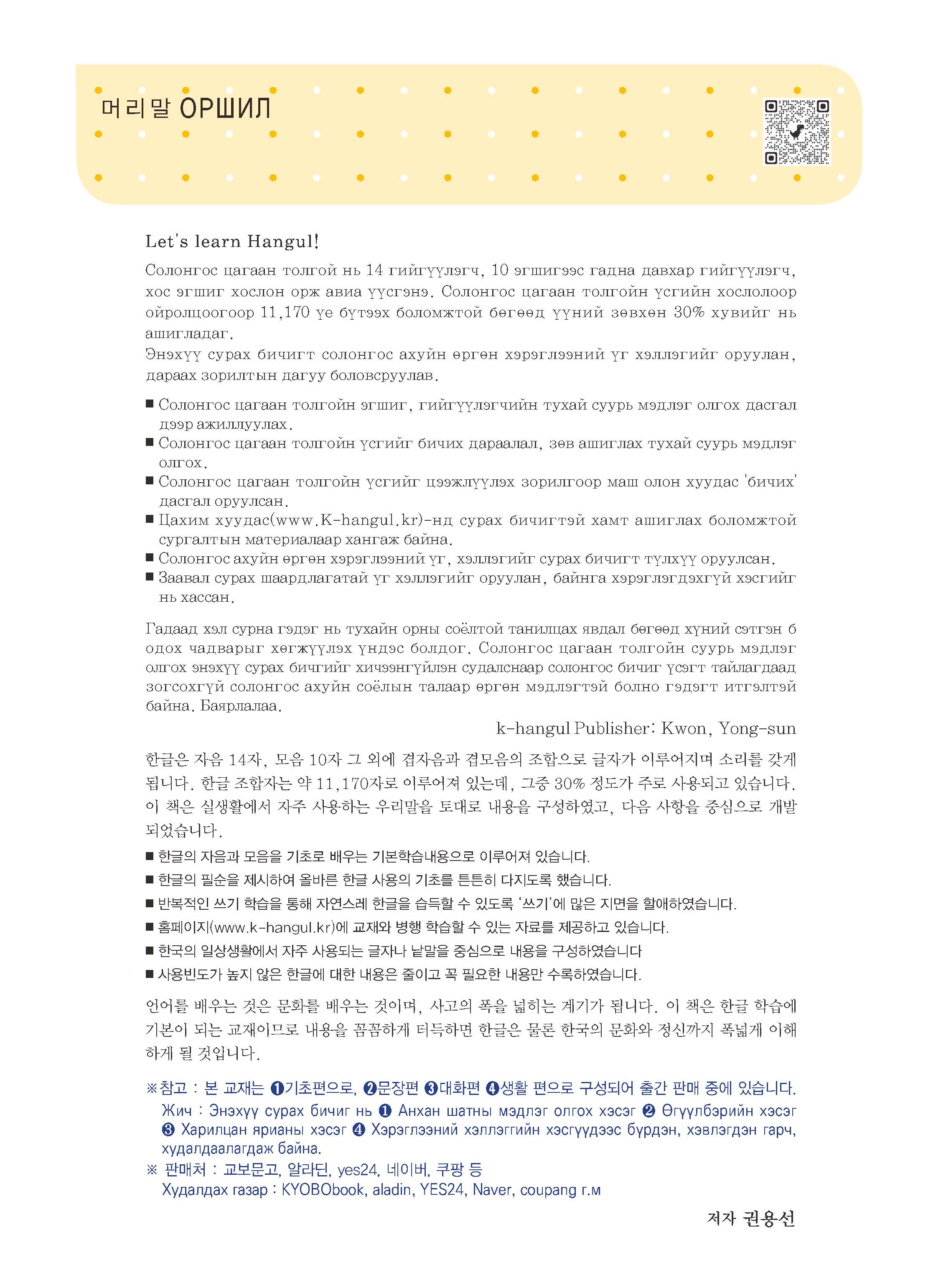 '외국인을 위한 기초 한글 배우기'는 2016년 초판이 출간되어, 현재 교보문고, 예스24,